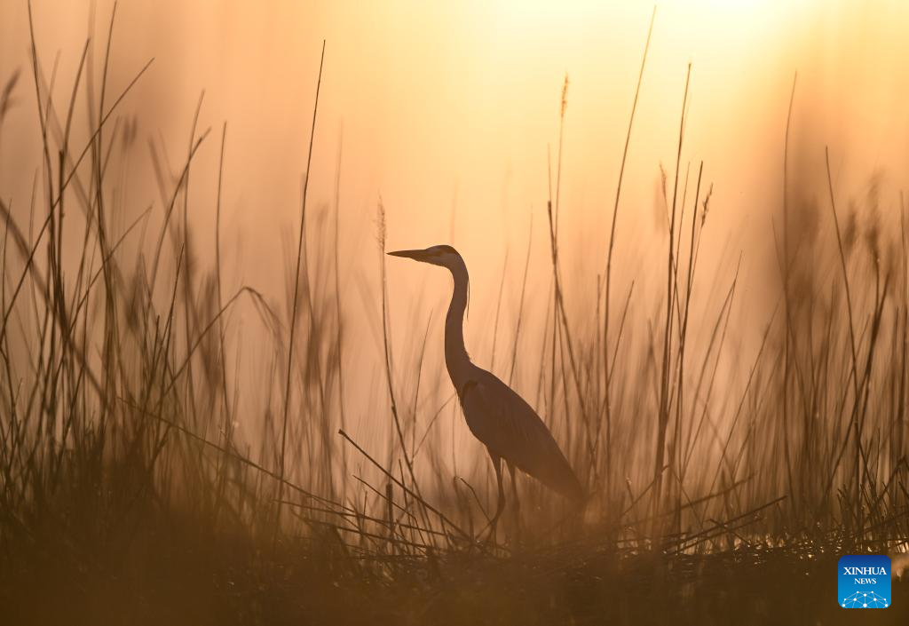 Herons are pictured among reeds at Shahu scenic area in Pingluo County of Shizuishan City in northwest China's Ningxia Hui Autonomous Region, April 18, 2026. From March to October each year, the Shahu scenic area serves as an important breeding habitat for migratory birds, featuring vast expanses of water, abundant plankton, fish and shrimp, and a variety of ecosystems.