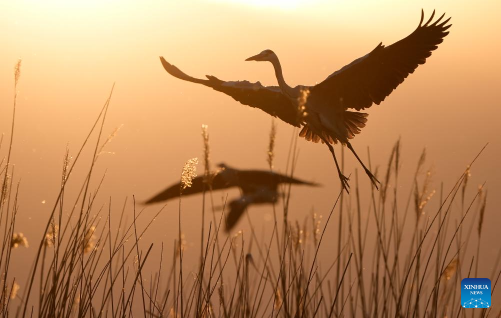 Herons fly over reeds at Shahu scenic area in Pingluo County of Shizuishan City in northwest China's Ningxia Hui Autonomous Region, April 17, 2026. From March to October each year, the Shahu scenic area serves as an important breeding habitat for migratory birds, featuring vast expanses of water, abundant plankton, fish and shrimp, and a variety of ecosystems.