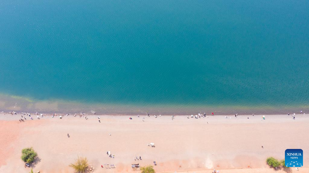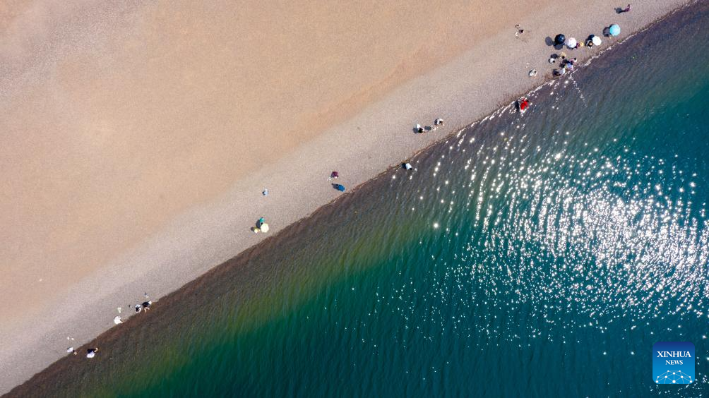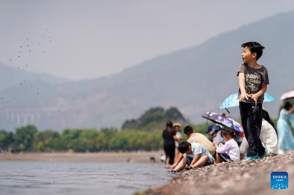 Children play by the Fuxian Lake in Yuxi City, southwest China's Yunnan Province, April 18, 2026. Fuxian Lake stretches out like a sapphire cradled by hills. It boasts Class I water quality, while its shores are now lined with bike paths and dotted with kayaks. (Xinhua/Peng Yikai)