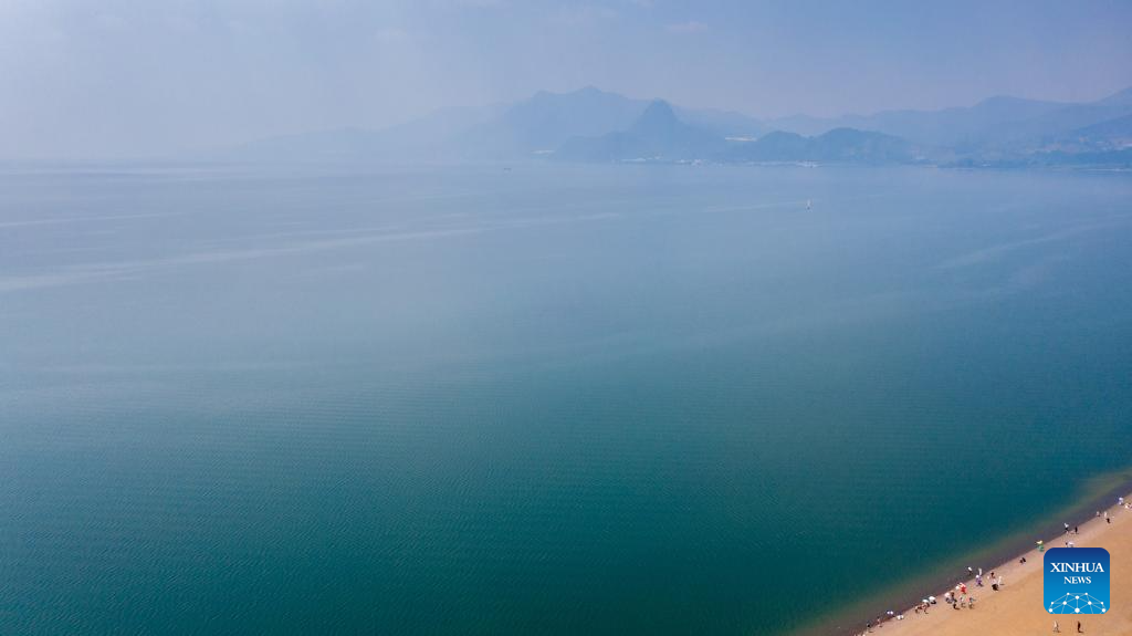An aerial drone photo taken on April 18, 2026 shows a view of the Fuxian Lake in Yuxi City, southwest China's Yunnan Province. Fuxian Lake stretches out like a sapphire cradled by hills. It boasts Class I water quality, while its shores are now lined with bike paths and dotted with kayaks. (Xinhua/Peng Yikai)