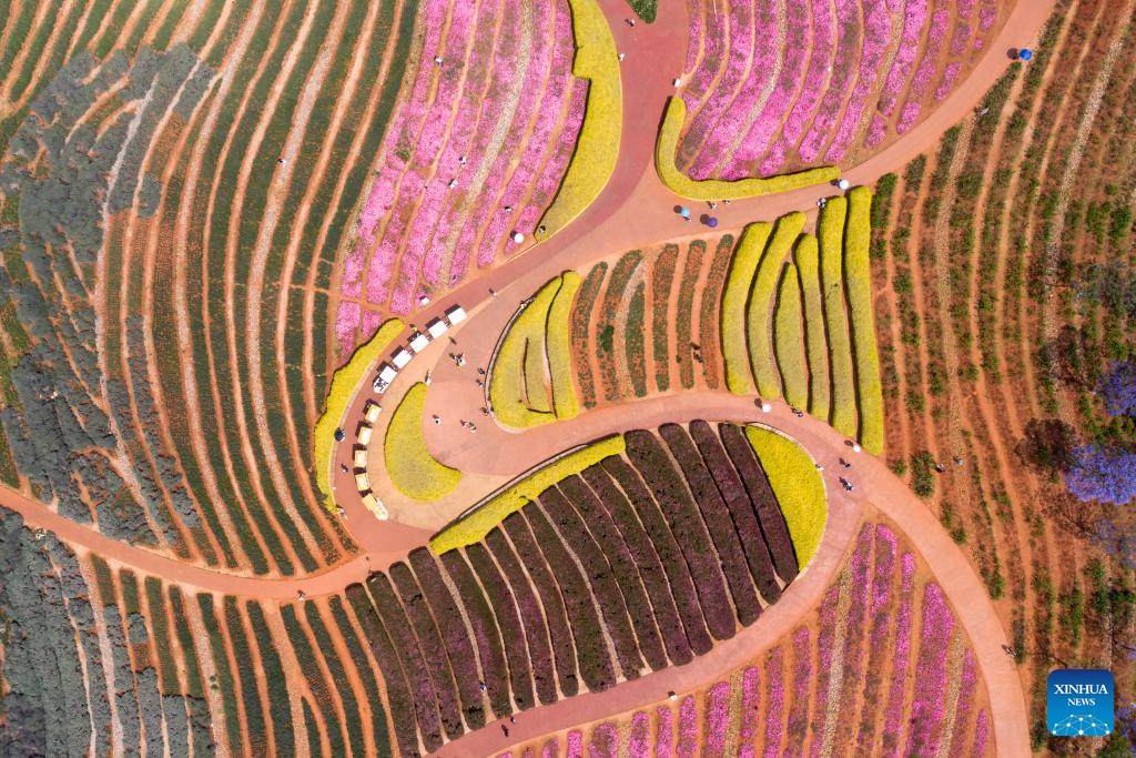 An aerial drone photo taken on April 18, 2026 shows a view of a garden by the Fuxian Lake in Yuxi City, southwest China's Yunnan Province. Fuxian Lake stretches out like a sapphire cradled by hills. It boasts Class I water quality, while its shores are now lined with bike paths and dotted with kayaks. (Xinhua/Peng Yikai)
