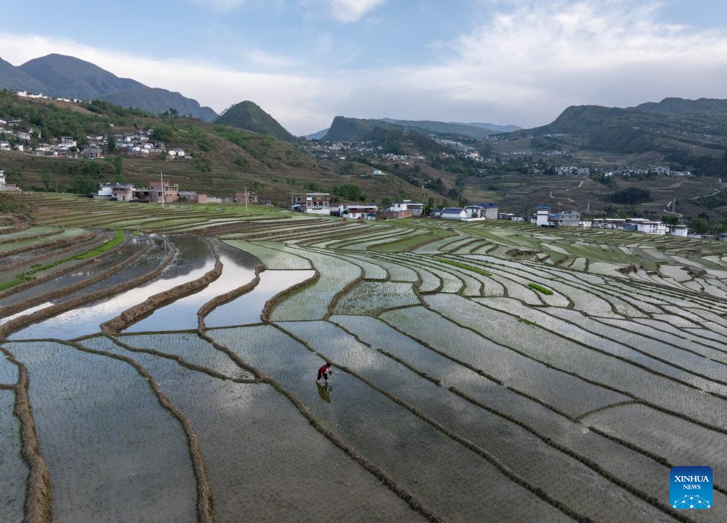 Villagers plant rice seedlings in terraced fields in Ganluo County, southwest China's Sichuan Province, April 18, 2026. (Xinhua/Jiang Hongjing)