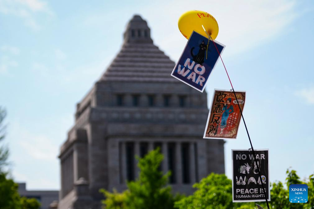 About 36,000 people attended the rally, organizers said, the second protest to draw about 30,000 people near the National Diet Building against constitutional revision since April 8. (Xinhua/Jia Haocheng)