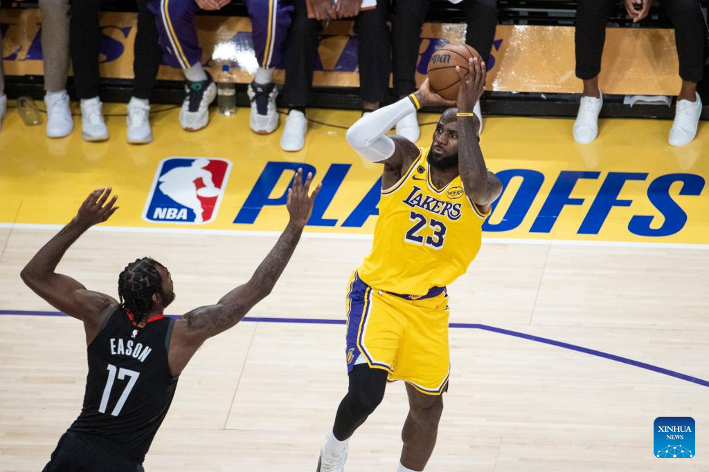 Los Angeles Lakers' LeBron James (C) goes to the basket during the 2025-2026 NBA first-round playoff series basketball match between Los Angeles Lakers and Houston Rockets in Los Angeles, the United States, April 18, 2026. (Photo by Ringo Chiu/Xinhua)