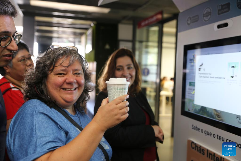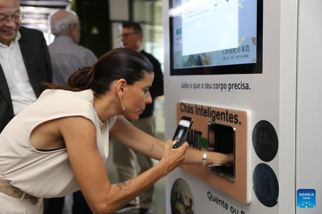 A woman films as she takes out a cup of herbal beverage tailored for her by a traditional Chinese medicine (TCM) intelligent robot at the Instituto Universitario Egas Moniz in Lisbon, Portugal, April 17, 2026. Medical professionals from China and Portugal, alongside faculty and students, gathered to witness a TCM intelligent robot's debut on Friday here in Lisbon. (Xinhua/Xun Wei)