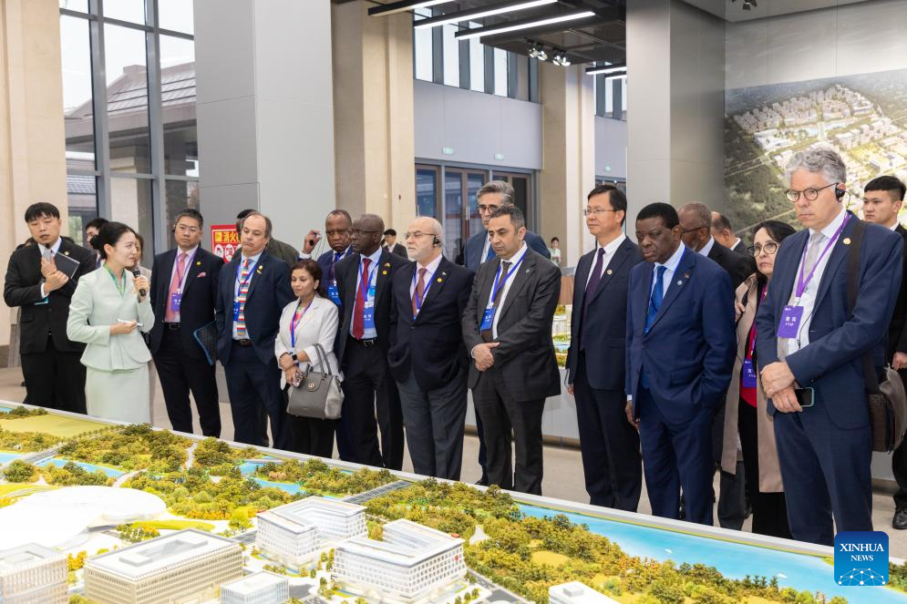 Foreign envoys visit the comprehensive service center at the start-up zone of Xiong'an New Area, north China's Hebei Province, April 16, 2026. A group of ambassadors, representatives and senior diplomats from 24 countries and international organizations, including Argentina, Jordan and Slovakia, visited north China's Hebei Province from April 14 to 16 at the invitation of the Ministry of Foreign Affairs. The tour focused on the region's industrial innovation, traditional culture and urban development. (Photo by Li Xin/Xinhua)