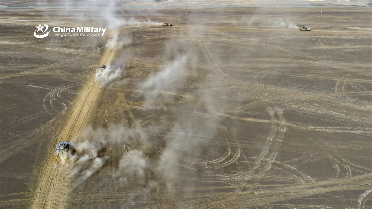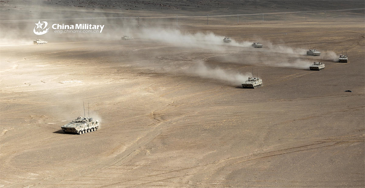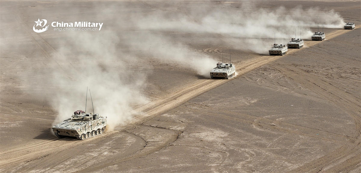 ZBD-04A tracked infantry fighting vehicles (IFV) attached to a brigade under the Chinese PLA Army move towards the designated area during a driving skill training exercise on April 2, 2026. (eng.chinamil.com.cn/Photo by Liu Jiyang)