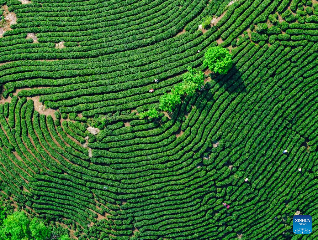 An aerial drone photo taken on April 16, 2026 shows farmers picking tea leaves at a tea garden in Houkeng Village of Xinming Township, Huangshan City of east China's Anhui Province. (Photo by Shi Yalei/Xinhua)