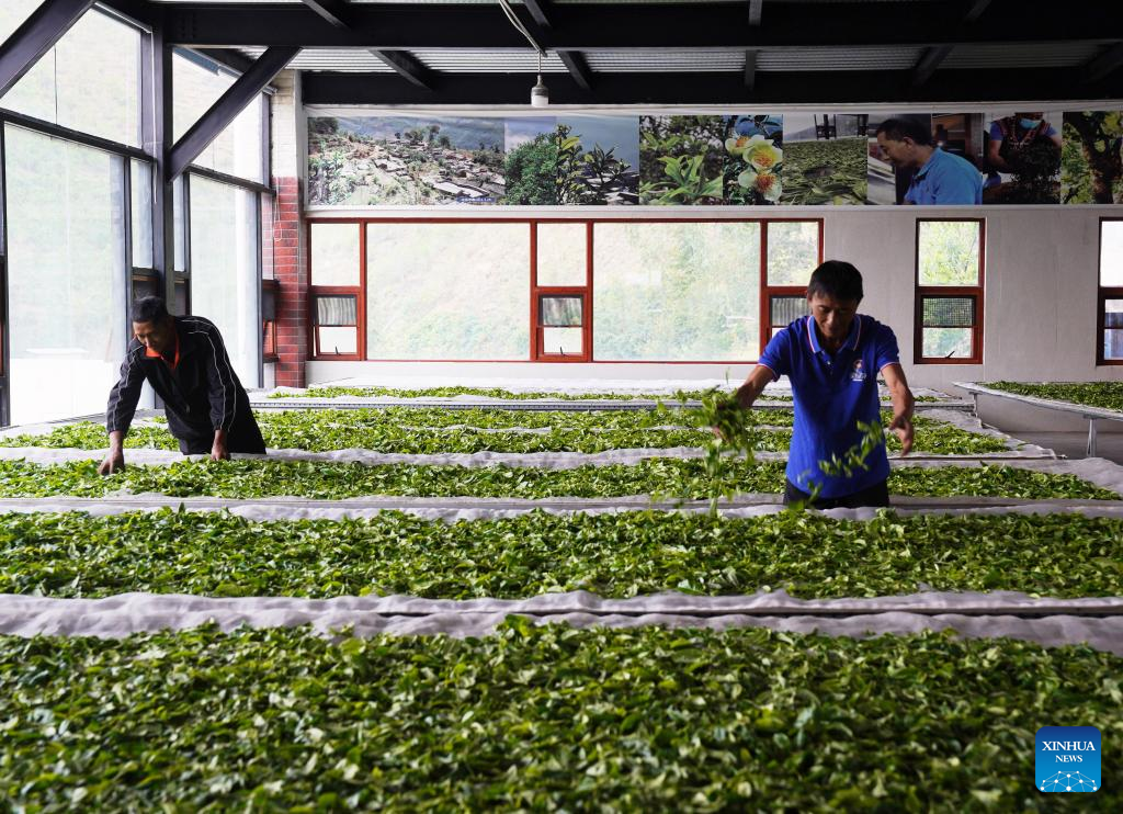 Villagers dry the freshly picked tea leaves in Bingdao Village of Mengku Town, Lincang City of southwest China's Yunnan Province, April 14, 2026. (Photo by Liang Zhiqiang/Xinhua)