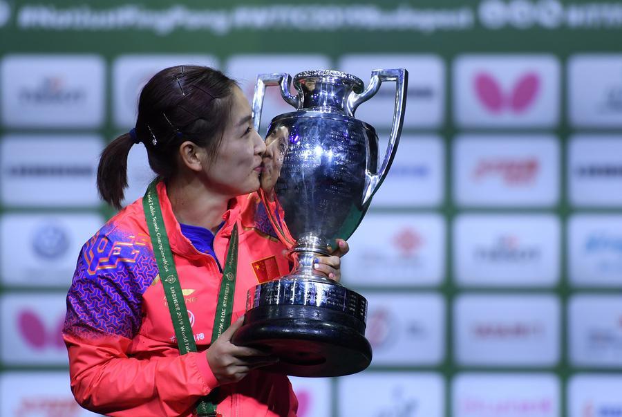 Liu kisses the trophy after winning the women's singles at the 2019 ITTF World Table Tennis Championships in Budapest, Hungary on April 27, 2019. (Xinhua/Lu Yang)