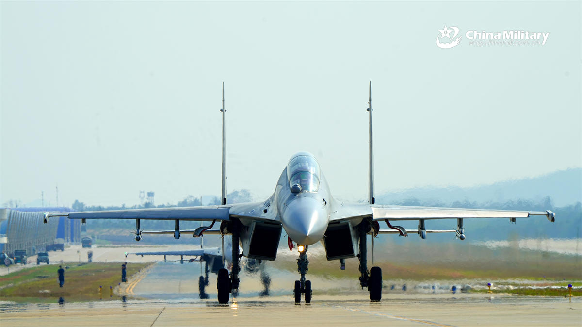 J-16 fighter jets attached to a unit under the Chinese PLA Air Force taxi on the runway during a training exercise on April 3, 2026. (eng.chinamil.com.cn/Photo by Jiang Guangzhen)