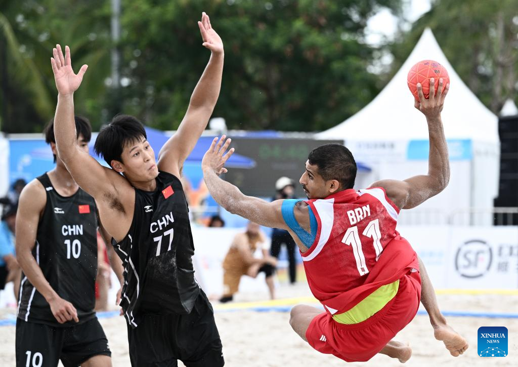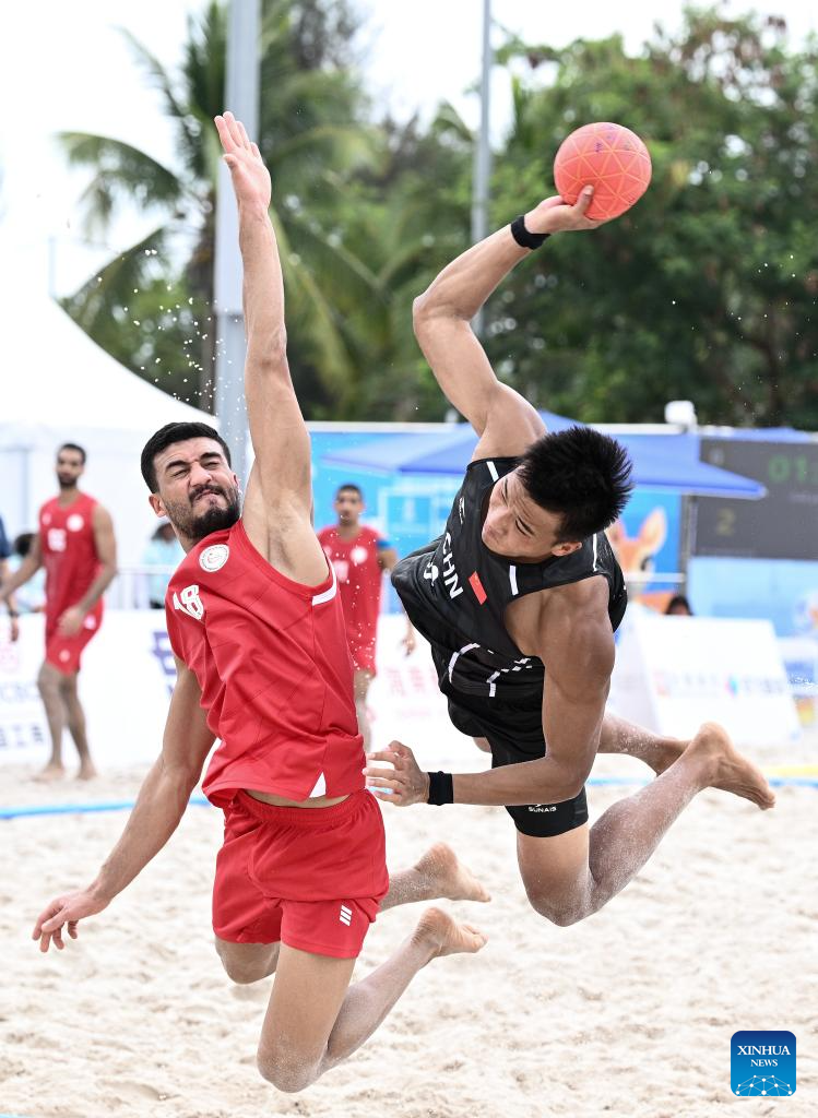 Komail Ghuloom (L) of Bahrain competes during the beach handball men's preliminary round group A match between China and Bahrain at the 6th Asian Beach Games in Sanya, south China's Hainan Province, April 21, 2026. (Xinhua/Yang Guanyu)
