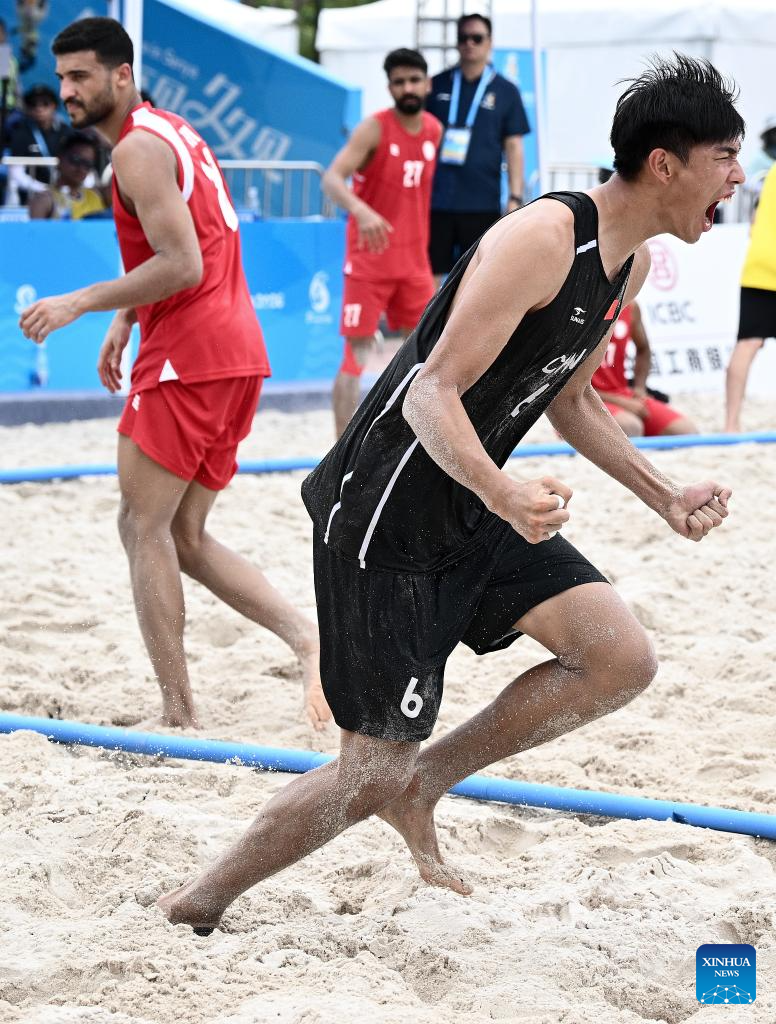 Cao Haoxiang (R) of China reacts during the beach handball men's preliminary round group A match between China and Bahrain at the 6th Asian Beach Games in Sanya, south China's Hainan Province, April 21, 2026. (Xinhua/Yang Guanyu)