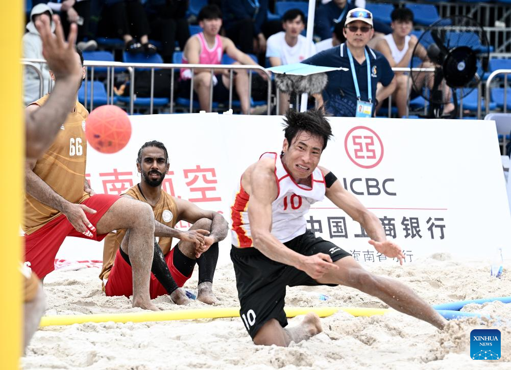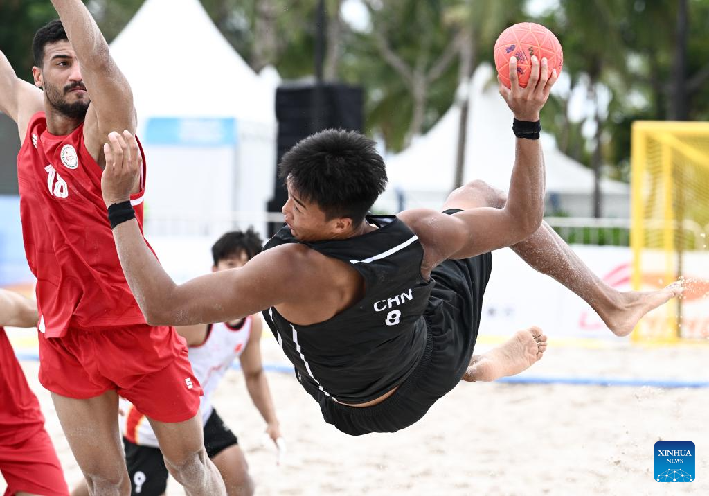 Ma Huifeng (R) of China competes during the beach handball men's preliminary round group A match between China and Bahrain at the 6th Asian Beach Games in Sanya, south China's Hainan Province, April 21, 2026. (Xinhua/Yang Guanyu)