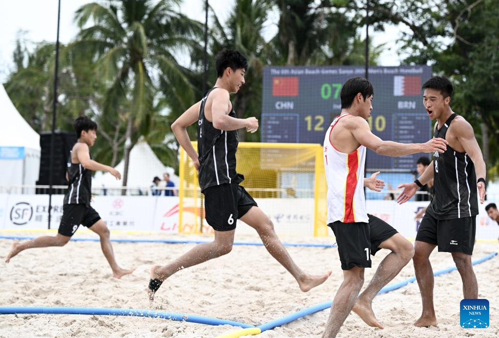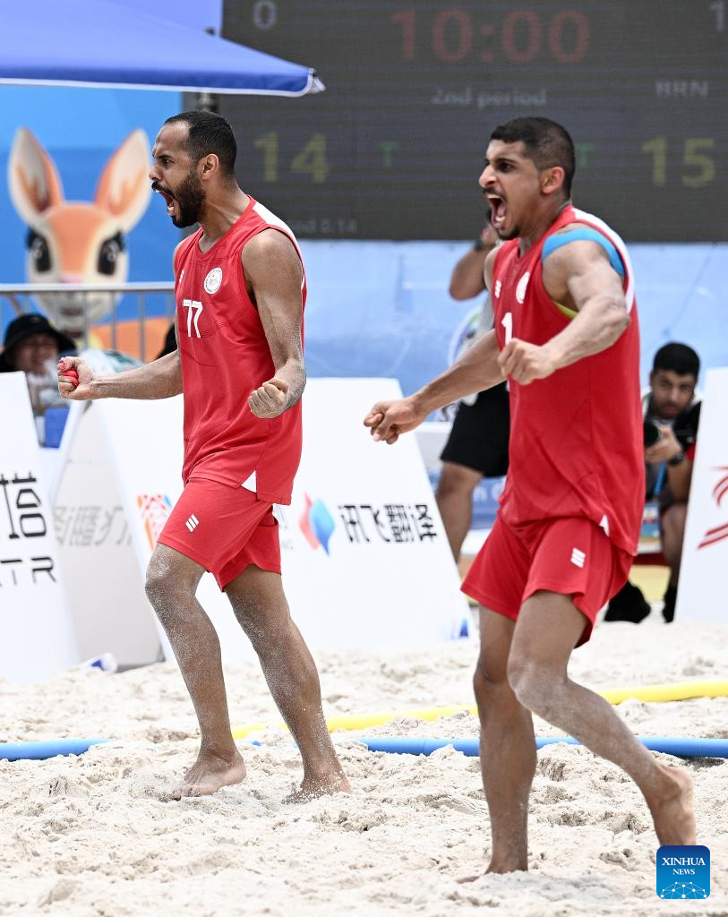 Players of Bahrain celebrate during the beach handball men's preliminary round group A match between China and Bahrain at the 6th Asian Beach Games in Sanya, south China's Hainan Province, April 21, 2026. (Xinhua/Yang Guanyu)