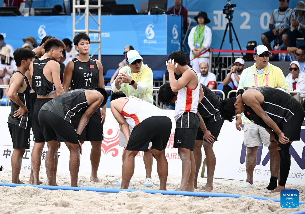 Players of China listen to the instructions from their coach during the beach handball men's preliminary round group A match between China and Bahrain at the 6th Asian Beach Games in Sanya, south China's Hainan Province, April 21, 2026. (Xinhua/Yang Guanyu)