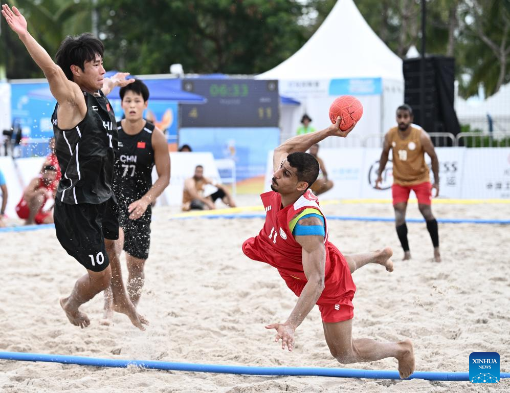 Mahdi Mahdi (R) of Bahrain competes during the beach handball men's preliminary round group A match between China and Bahrain at the 6th Asian Beach Games in Sanya, south China's Hainan Province, April 21, 2026. (Xinhua/Yang Guanyu)