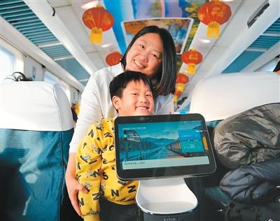 Passengers interact with a service robot aboard train 4181, which runs between Hailar district in Hulun Buir and Mangui town in Genhe, a county-level city under Hulun Buir, north China's Inner Mongolia Autonomous Region. (Photo courtesy of China Railway Harbin Group Co., Ltd.)