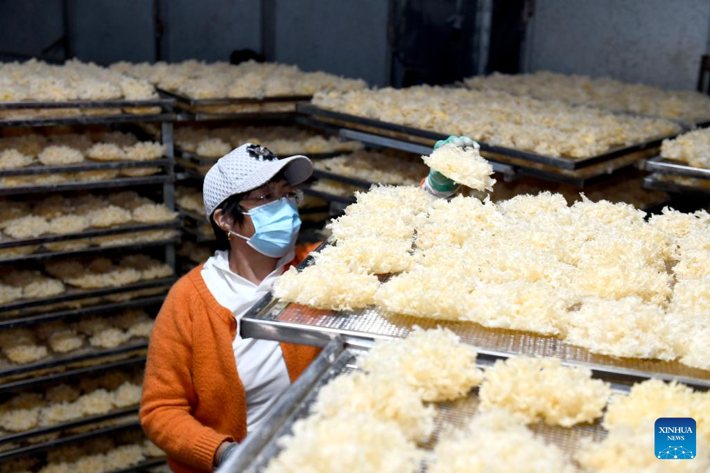 A mushroom farmer checks on dried mushrooms in Huimin County, east China's Shandong Province, April 22, 2026. In recent years, Huimin County has gradually developed the mushroom industry into a distinctive sector that empowers rural revitalization. (Xinhua/Guo Xulei)