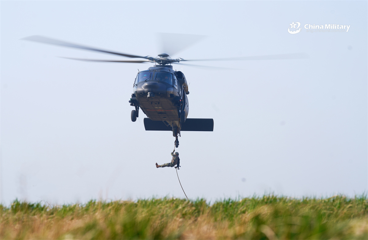 A soldier assigned to an army brigade under the Chinese PLA Northern Theater Command fast-ropes down a Z-20 utility helicopter during a ground-aerial coordination training exercise in early April, 2026. (eng.chinamil.com.cn/Photo by Nie Wangsha)