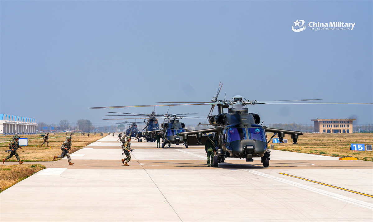Soldiers assigned to an army brigade under the Chinese PLA Northern Theater Command board multiple types of helicopters during a ground-aerial coordination training exercise in early April, 2026. (eng.chinamil.com.cn/Photo by Nie Wangsha)