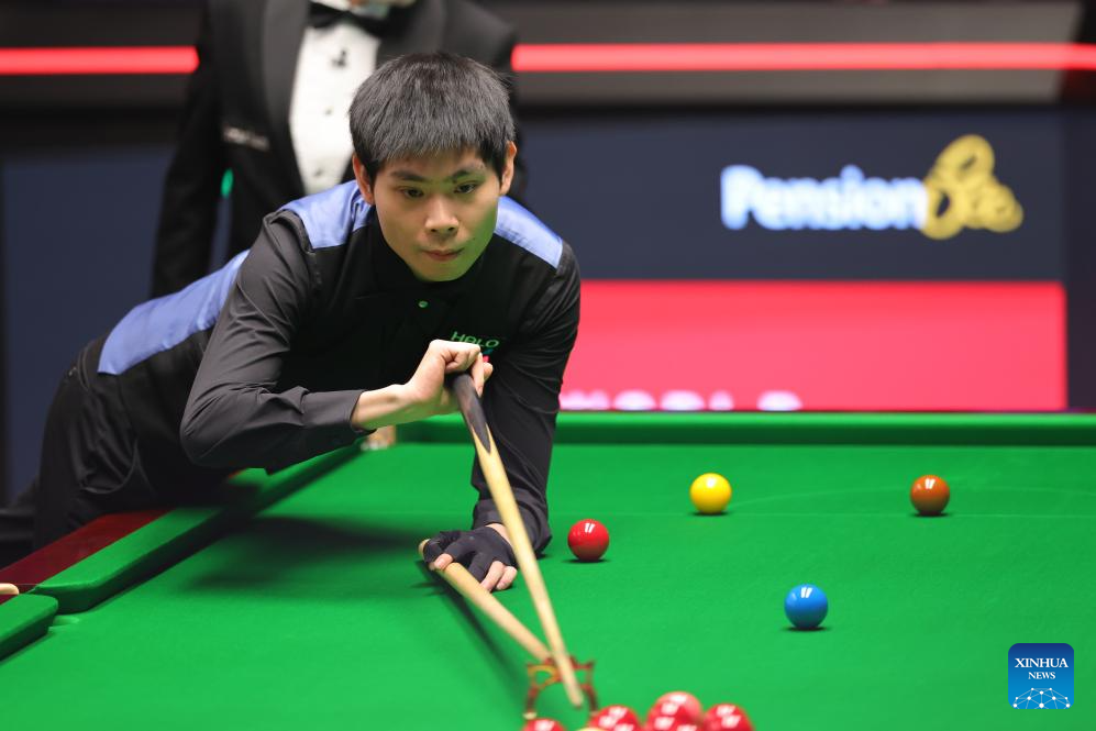 He Guoqiang competes during the round 1 match between Ronnie O'Sullivan of England and He Guoqiang of China at the World Snooker Championship 2026 in Sheffield, Britain, on April 22, 2026. (Photo by Zhai Zheng/Xinhua)