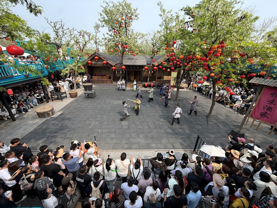 In the theme park, there are over 100 such plays a day, catering to an enthusiastic audience. During the three-day Qingming Festival holiday earlier this month, a show depicting an epic siege in the novel attracted nearly 4,000 spectators per show. It was staged three times daily by over 100 actors, including 20 cavaliers.