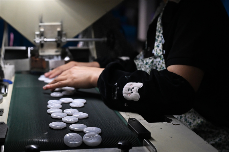 A staff member conducts quality inspection on buttons at a workshop in Qiaotou Town of Yongjia County, Wenzhou City, east China's Zhejiang Province, March 27, 2025. (Photo/Xinhua)
