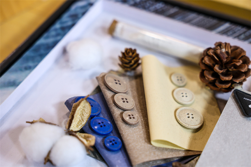 This photo taken on March 27, 2025 shows a type of eco-friendly button made from recycled materials displayed by a button company in Qiaotou Town of Yongjia County, Wenzhou City, east China's Zhejiang Province. (Photo/Xinhua)
