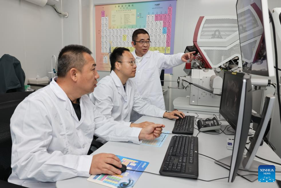 This file photo taken on April 2026 shows researchers discussing the cutting plan for preparing a single crystal particle of the magnesiochangesite-(Y) in Beijing, capital of China. (China National Nuclear Corporation/Handout via Xinhua)