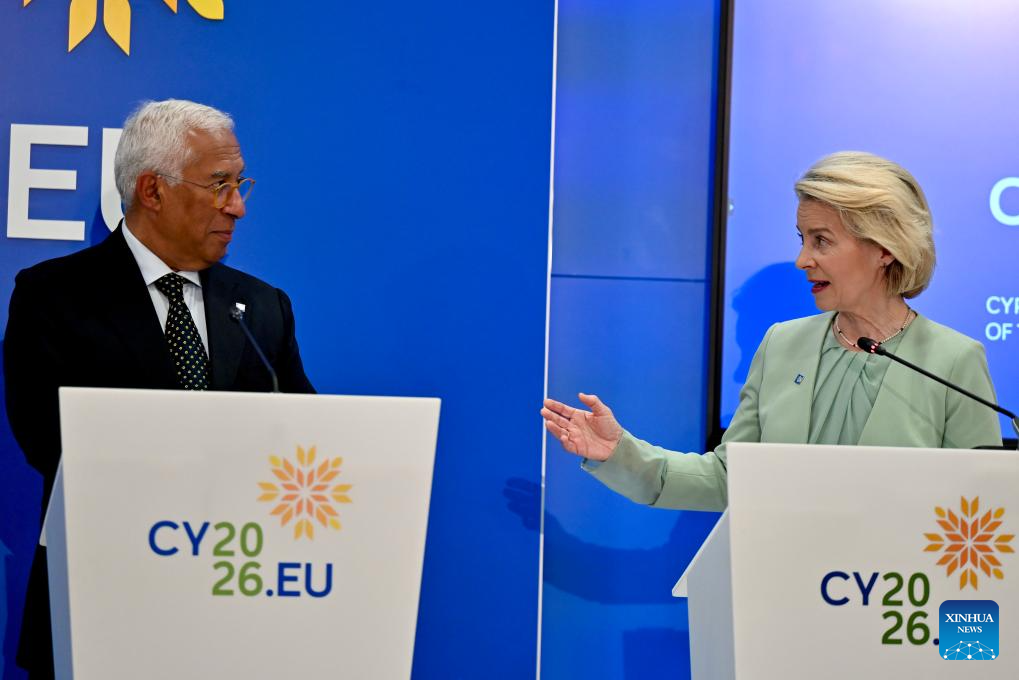 European Council President Antonio Costa (L) and European Commission President Ursula von der Leyen attend a press conference after an EU summit in Nicosia, Cyprus, April 24, 2026. (Xinhua/Lyu You)