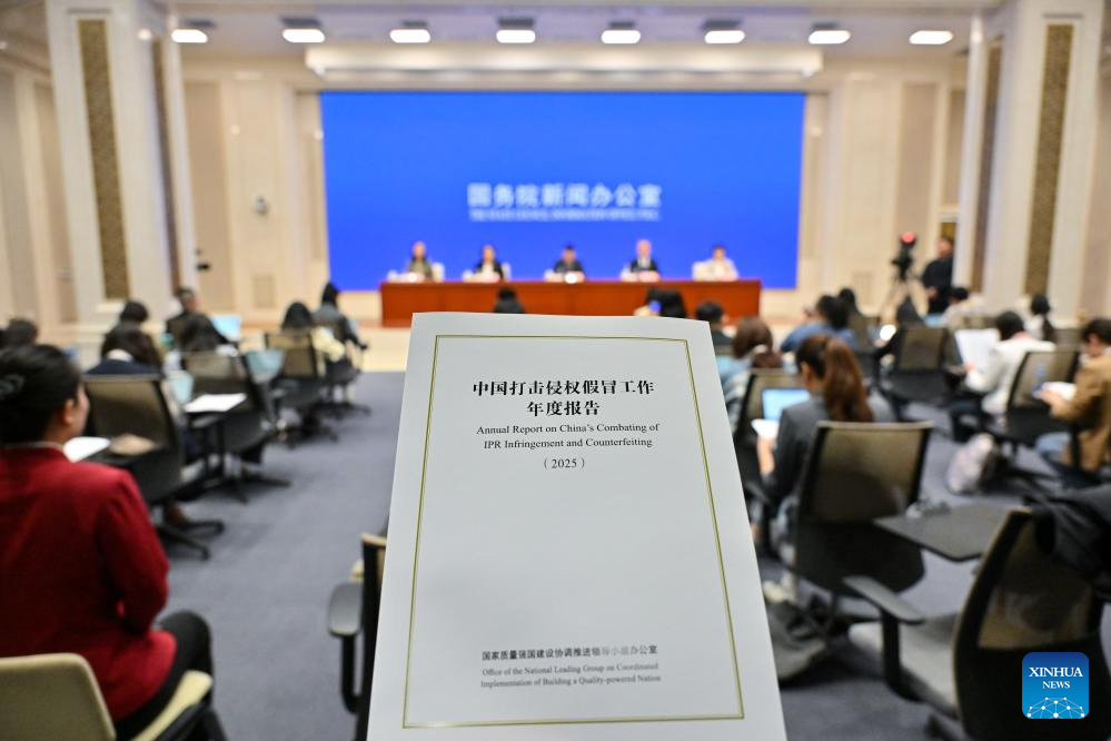 The State Council Information Office (SCIO) holds a press conference about the "Annual Report on China's Combating of IPR Infringement and Counterfeiting (2025)" in Beijing, capital of China, April 24, 2026. (Xinhua/Sun Ruibo)