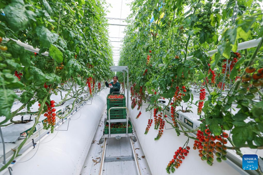 A farmer picks tomatoes at a greenhouse in Huangwan Town of east China's Zhejiang Province, April 15, 2026. In Zhejiang, the birthplace of the landmark Green Rural Revival Program, rural transformation over the past 23 years has evolved from merely improving living conditions to delivering common prosperity while building beautiful villages.