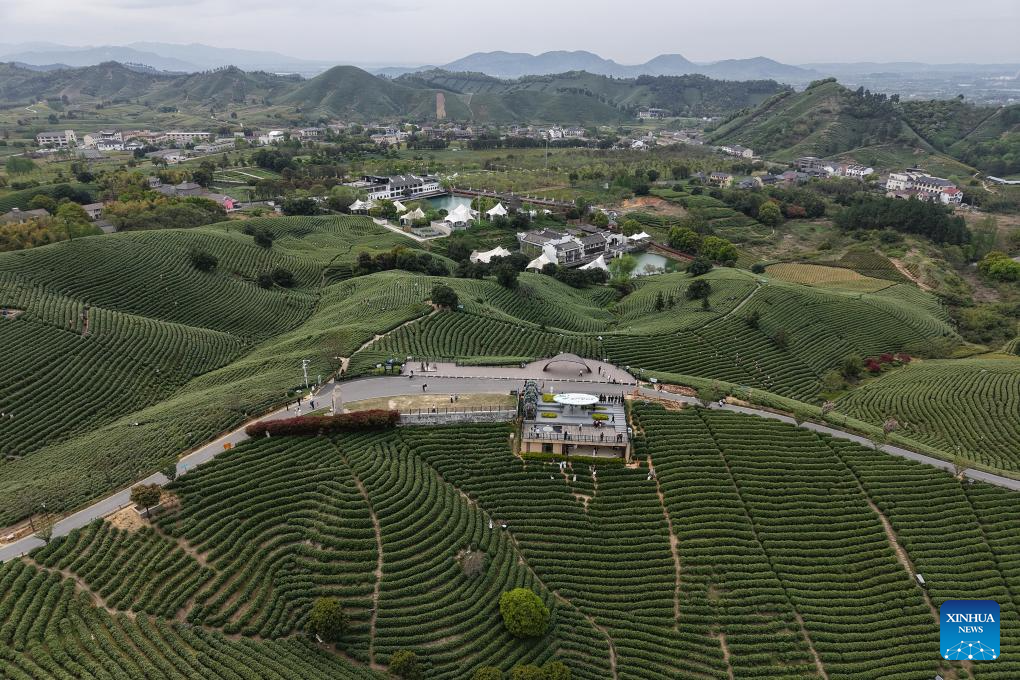 An aerial drone photo taken on April 8, 2026 shows tea gardens in Huangdu Village of Anji County, east China's Zhejiang Province. In Zhejiang, the birthplace of the landmark Green Rural Revival Program, rural transformation over the past 23 years has evolved from merely improving living conditions to delivering common prosperity while building beautiful villages.