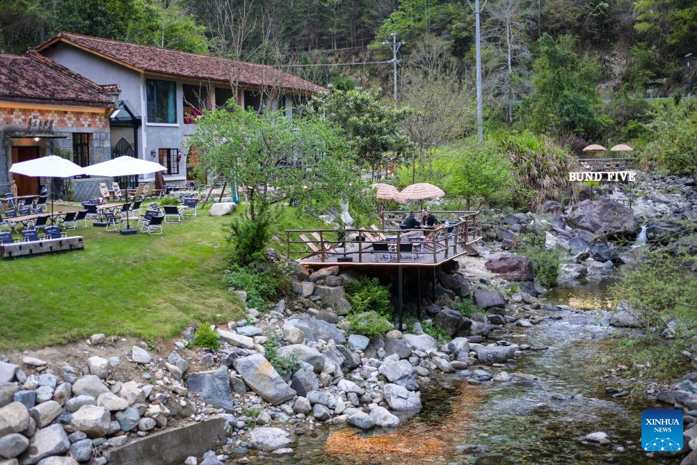 Tourists take a rest at a rural homestay converted from a hydropower station in Jingning She Autonomous County, east China's Zhejiang Province, March 29, 2026. In Zhejiang, the birthplace of the landmark Green Rural Revival Program, rural transformation over the past 23 years has evolved from merely improving living conditions to delivering common prosperity while building beautiful villages.