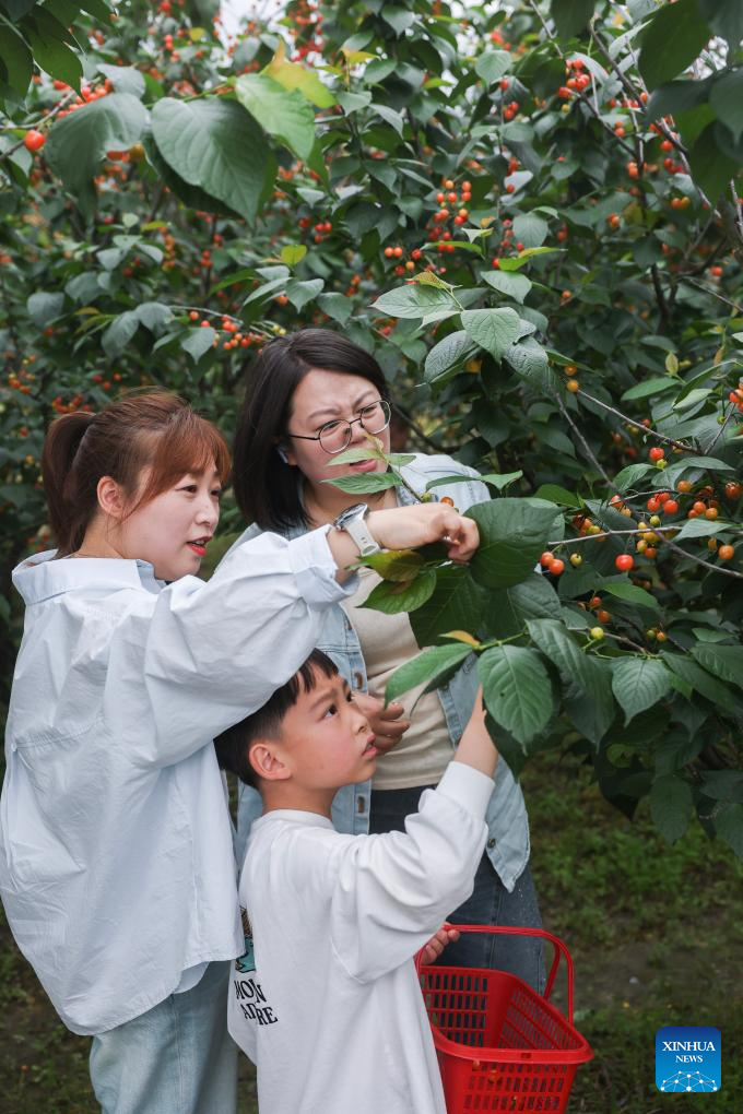 Tourists pick cherries at an orchard in Zhaojia Town of Zhuji City, east China's Zhejiang Province, April 18, 2026. In Zhejiang, the birthplace of the landmark Green Rural Revival Program, rural transformation over the past 23 years has evolved from merely improving living conditions to delivering common prosperity while building beautiful villages.