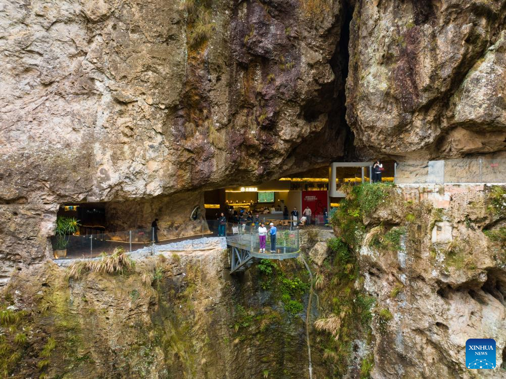 A drone photo taken on March 30, 2026 shows a cafe on the cliffside at the Yandang Mountain scenic spot in east China's Zhejiang Province. In Zhejiang, the birthplace of the landmark Green Rural Revival Program, rural transformation over the past 23 years has evolved from merely improving living conditions to delivering common prosperity while building beautiful villages.