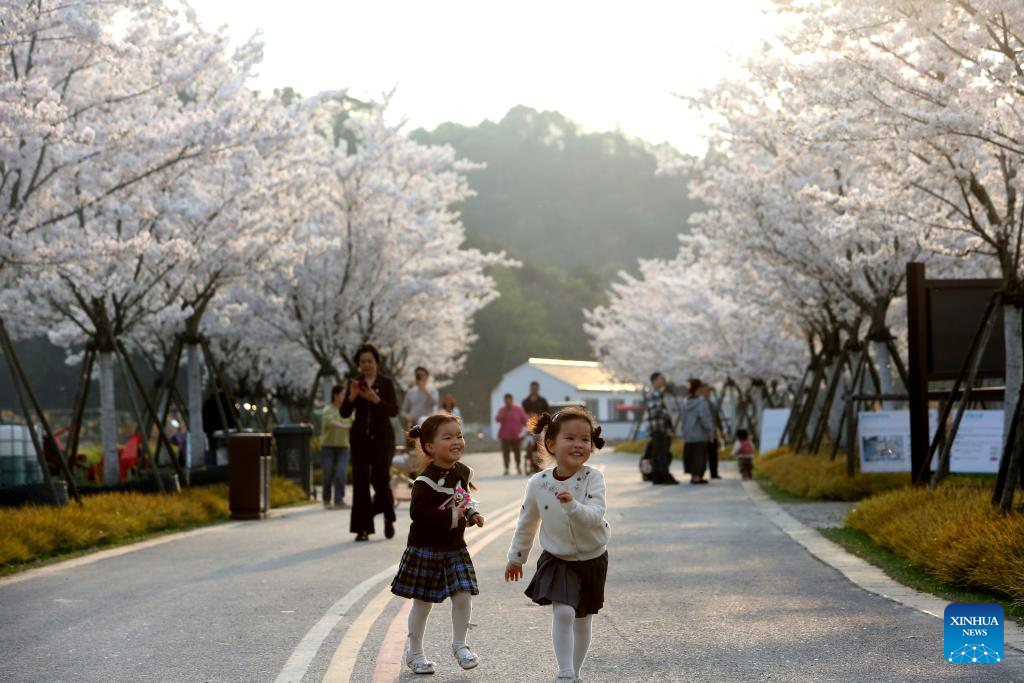 Children have fun under cherry blossom trees in Xiaoshan District of Hangzhou, east China's Zhejiang Province, March 29, 2026. In Zhejiang, the birthplace of the landmark Green Rural Revival Program, rural transformation over the past 23 years has evolved from merely improving living conditions to delivering common prosperity while building beautiful villages.