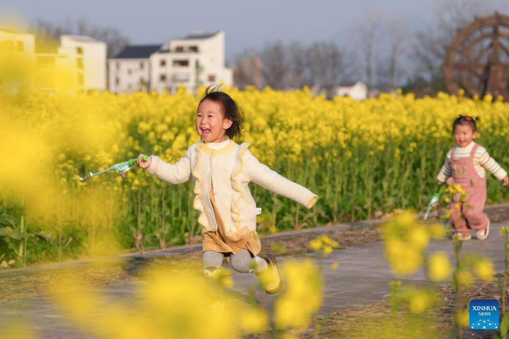 Children have fun in flowering canola fields in Meirong Village of Tonglu County, east China's Zhejiang Province, March 11, 2026. In Zhejiang, the birthplace of the landmark Green Rural Revival Program, rural transformation over the past 23 years has evolved from merely improving living conditions to delivering common prosperity while building beautiful villages.
