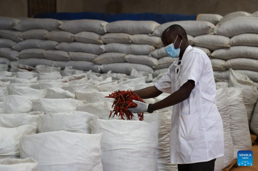 Grishon Nahimana, production manager of Fisher Global, checks the dried chili pepper at the agricultural factory Fisher Global in the Rwamagana Industrial Park, Eastern Province, Rwanda, April 14, 2026. (Xinhua/Ju Yinhe)