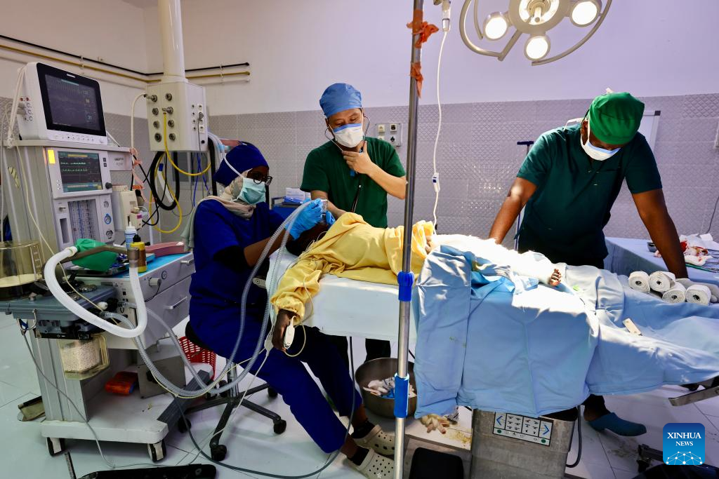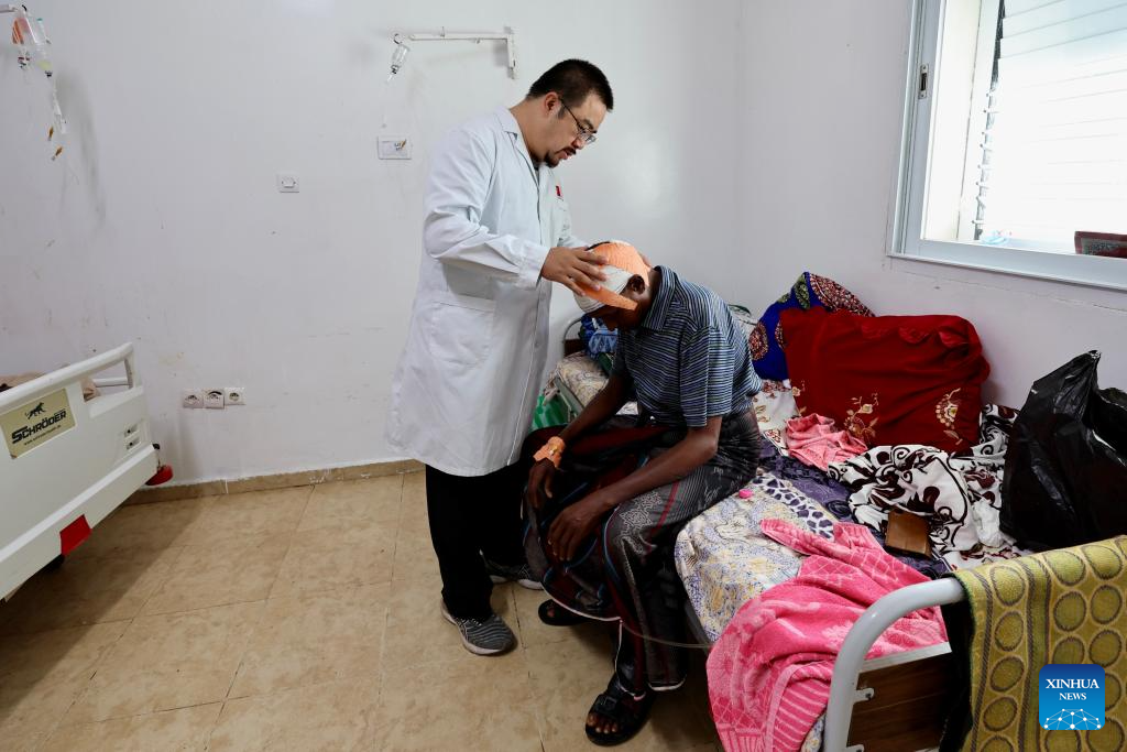 Nie Xiaodong, a doctor with the 24th batch of the Chinese medical team in Djibouti, evaluates the patient's recovery after surgery at Peltier General Hospital in Djibouti City, the capital of Djibouti, April 12, 2026. (Xinhua/Geng Xinning)