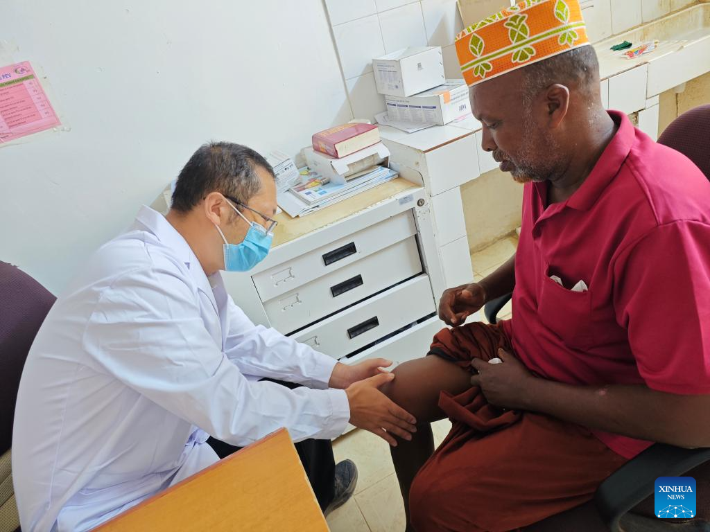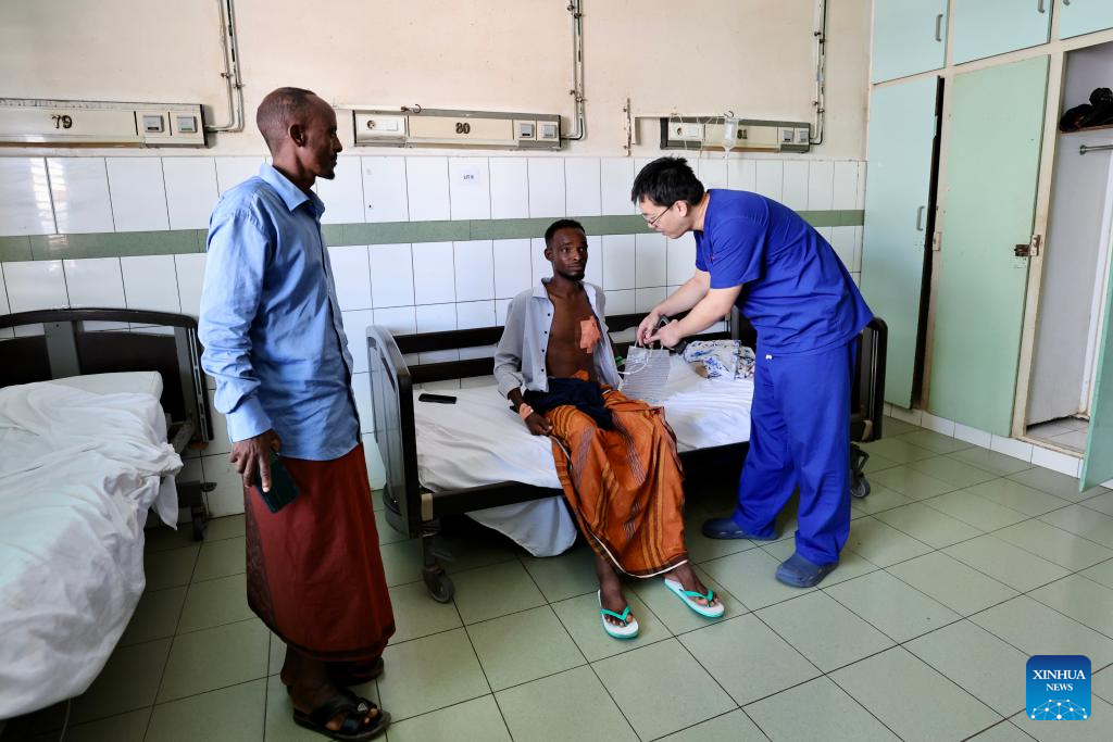 Liang Xingyu, head of the 24th batch of the Chinese medical team in Djibouti, conducts an examination on a patient at Peltier General Hospital in Djibouti City, the capital of Djibouti, Nov. 5, 2025. (The 24th batch of the Chinese medical team in Djibouti/Handout via Xinhua)