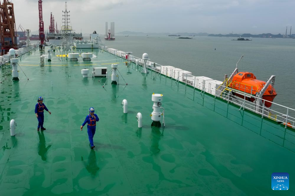 Staff members work on the car carrier Glovis Leader in Guangzhou, south China's Guangdong Province, April 28, 2026. A car carrier with a maximum capacity of 10,800 car equivalent units, described as the world's largest of its kind, was delivered Tuesday in the southern Chinese city of Guangzhou. The vessel, named Glovis Leader, was built by Guangzhou Shipyard International Company Limited under the China State Shipbuilding Corporation (CSSC), together with China Shipbuilding Trading Co., Ltd. It was delivered to HMM, a leading shipping company in the Republic of Korea (ROK). After delivery, the vessel will be operated by Hyundai Glovis Co., Ltd., a logistics company also based in the ROK. (Xinhua/Wu Lu)