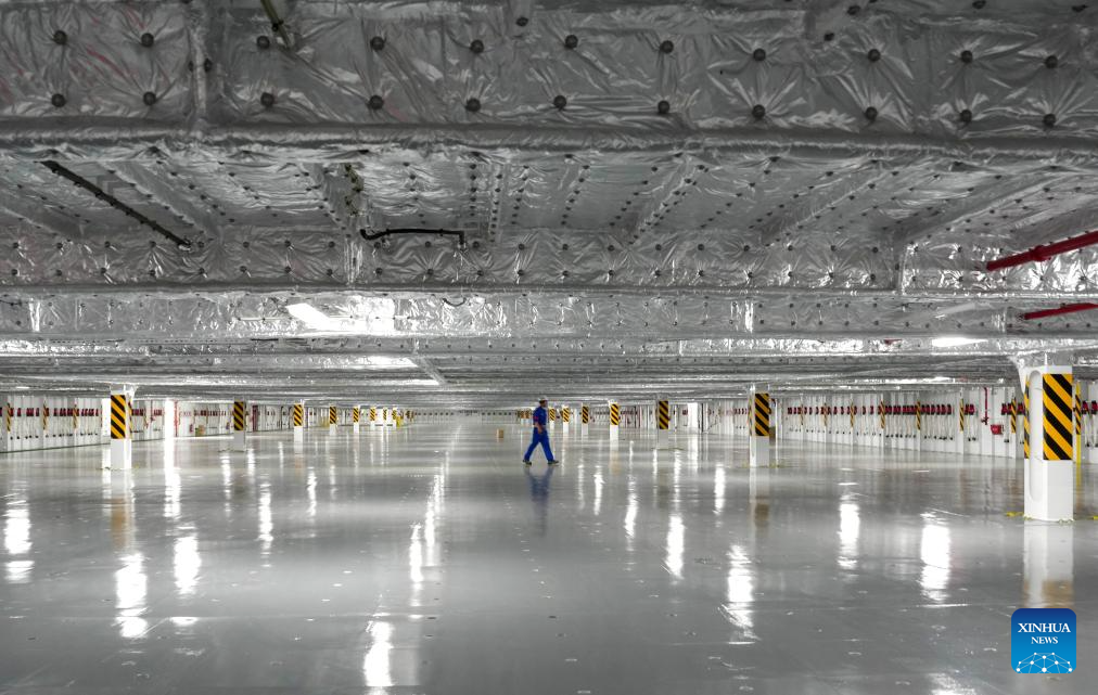 A staff member walks past the 14th story of the carpark on car carrier Glovis Leader in Guangzhou, south China's Guangdong Province, April 28, 2026. A car carrier with a maximum capacity of 10,800 car equivalent units, described as the world's largest of its kind, was delivered Tuesday in the southern Chinese city of Guangzhou. The vessel, named Glovis Leader, was built by Guangzhou Shipyard International Company Limited under the China State Shipbuilding Corporation (CSSC), together with China Shipbuilding Trading Co., Ltd. It was delivered to HMM, a leading shipping company in the Republic of Korea (ROK). After delivery, the vessel will be operated by Hyundai Glovis Co., Ltd., a logistics company also based in the ROK. (Xinhua/Wu Lu)