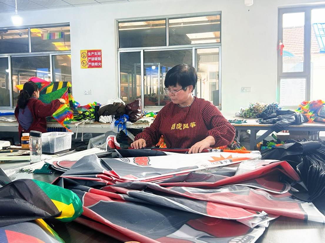 In spring, Wangjiazhuangzi village in the Fangzi Industrial Development Zone of Weifang, east China's Shandong Province, comes alive with the hum of sewing machines. Inside the workshops of Weifang Hongxin Kite Co., Ltd., workers race to fulfill orders, packaging brightly colored kites for markets at home and abroad.