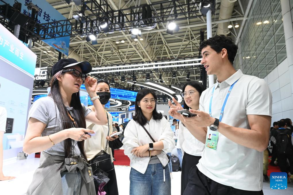 A visitor (1st L) tries AI glasses with real-time translation at the 9th Digital China Summit in Fuzhou, southeast China's Fujian Province, April 29, 2026. The summit, under the theme "Accelerating Innovation and Development in Digital Technologies and Deepening the Building of Digital China", opened here on Wednesday. (Xinhua/Lin Shanchuan)