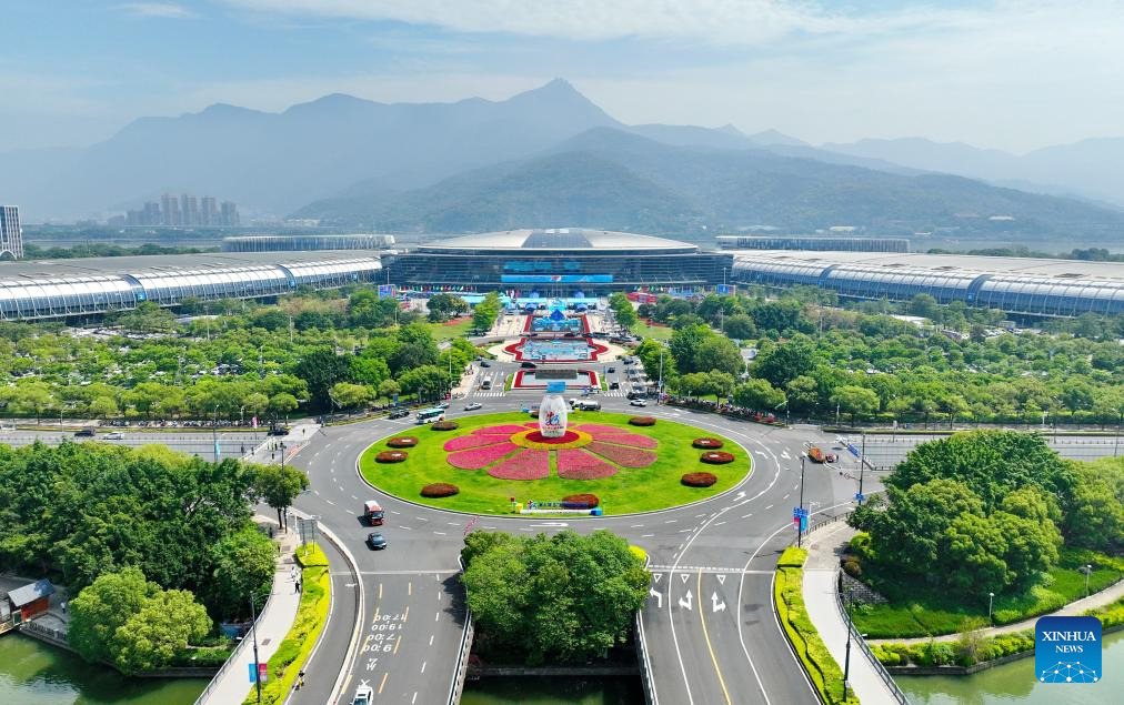 An aerial drone photo taken on April 28, 2026 shows Fuzhou Strait International Conference & Exhibition Center, the venue for the 9th Digital China Summit, in Fuzhou, southeast China's Fujian Province. The summit, under the theme "Accelerating Innovation and Development in Digital Technologies and Deepening the Building of Digital China", opened here on Wednesday. (Xinhua/Lin Shanchuan)