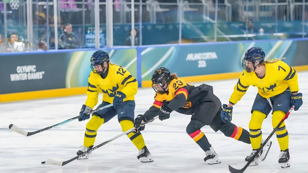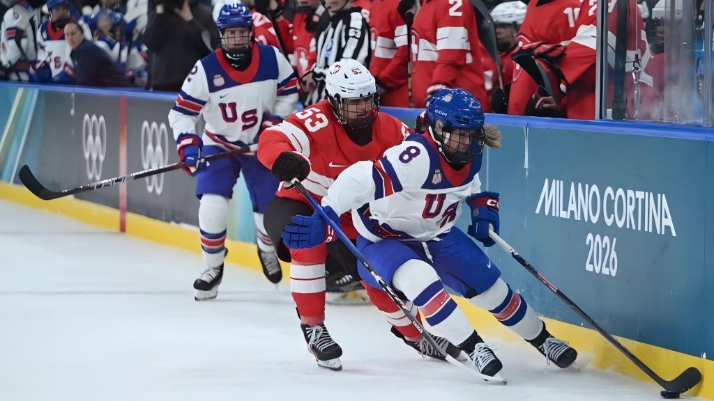 Vanessa Schaefer (C) of Switzerland vies with Grace Zumwinkle (R) of the United States during the ice hockey women's preliminary round group A match between Switzerland and the United States at the Milan-Cortina 2026 Olympic Winter Games in Milan, Italy, Feb. 9, 2026.