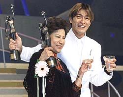 | Hong Kong actor and pop music star Andy Lau (R)and veteran actress Law Lan pose after winning the Best Actor and Best Actress awards at the 19th Hong Kong Film Awards presentation ceremony April 16. Lau plays as a thief with cancer in the movie "Running Out of Time" and Law as a mentally disabled woman in "Bullets Over Summer." (Full Story) |