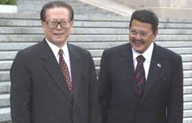 Chinese President Jiang Zemin and visiting Philippine President Joseph Ejercito Estrada review the guards of honor during the welcome ceremony in Beijing, May 16, 2000. (